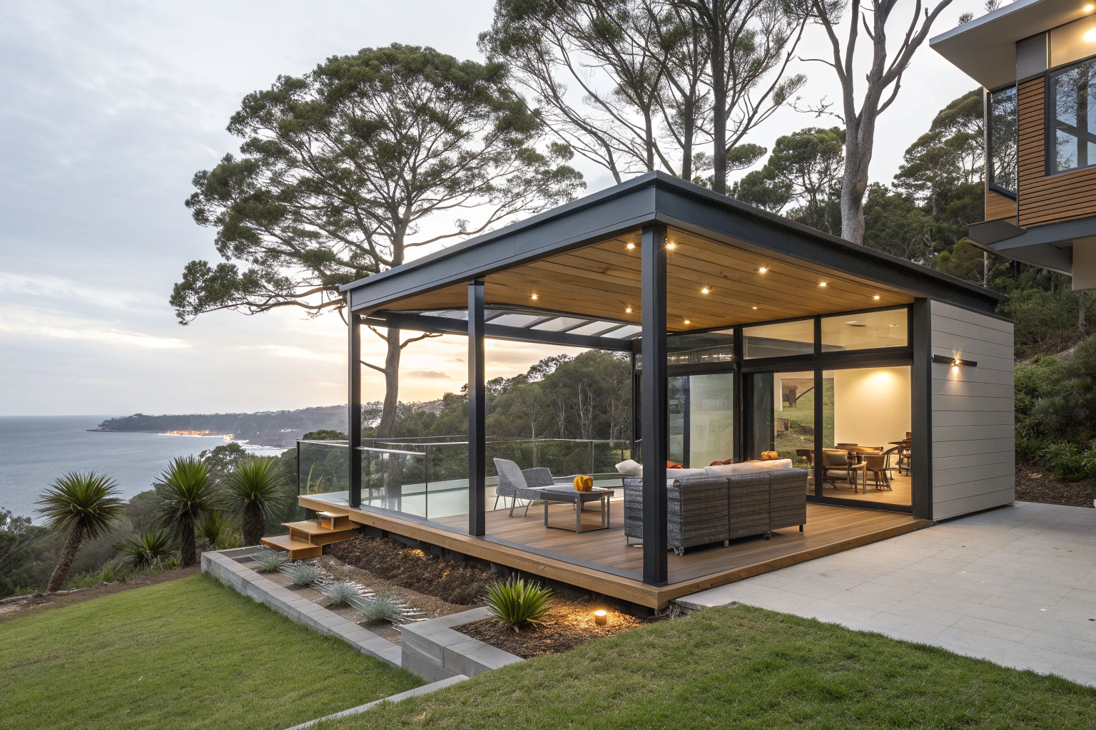Roof styles affect both appearance and performance. Gabled roofs provide classic appeal, hip roofs handle coastal winds better, domed designs create architectural interest, and flat roofs suit contemporary homes. Material choices include hardwood timber for natural warmth, steel frames for strength, or mixed materials combining both benefits.